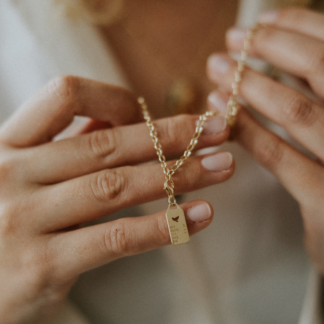 Autorski detal: Delikatna blaszka z logo bgood (litera „B”) przy zapięciu przypomina o Twojej tożsamości w Bogu.