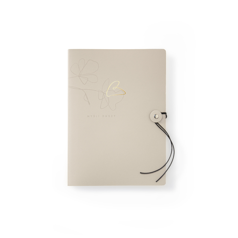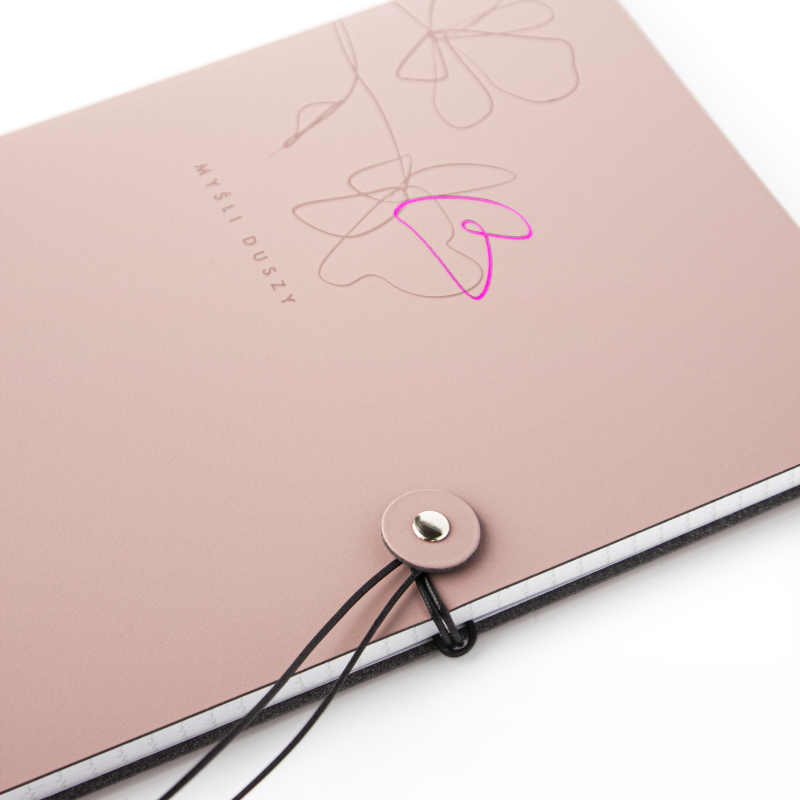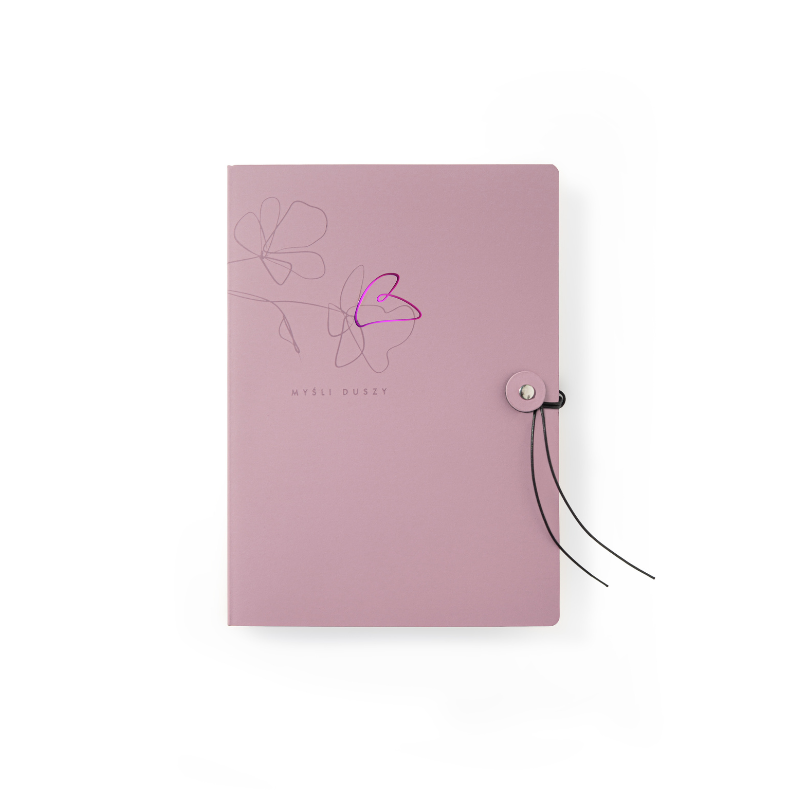 - Detale, które cieszą: Wyjątkowe zamknięcie na ozdobny czarny sznurek oraz zaokrąglone rogi okładki.