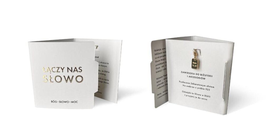 Częścią naszych produktów są ich unikatowe opakowania. Opakowanie na zawieszki zostało specjalnie zaprojektowane, aby wydobyć najistotniejszy szczegół tej kolekcji – to, że Słowo Boże łączy. Łączy nas z Bogiem, a także z drugim człowiekiem. Jest drogą do pokoju serca i pokoju w relacjach. Podobnie zawieszka – żeby mogła funkcjonować, trzeba ją z czymś połączyć. Kampania #ŁączyNasSłowo jest obecna w Social Mediach i łączy w społeczność ludzi czerpiących inspiracje z fragmentów Biblii.