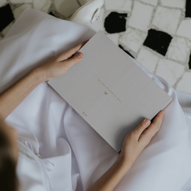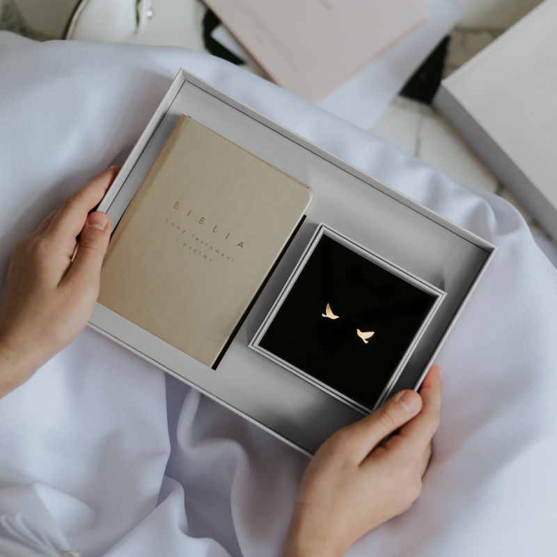 Wszystkie elementy pakujemy w twarde, eleganckie pudełko z tłoczeniem „Inspired by Greater Love”. Po uroczystości box staje się trwałym miejscem na przechowywanie pierwszych duchowych skarbów dziecka.